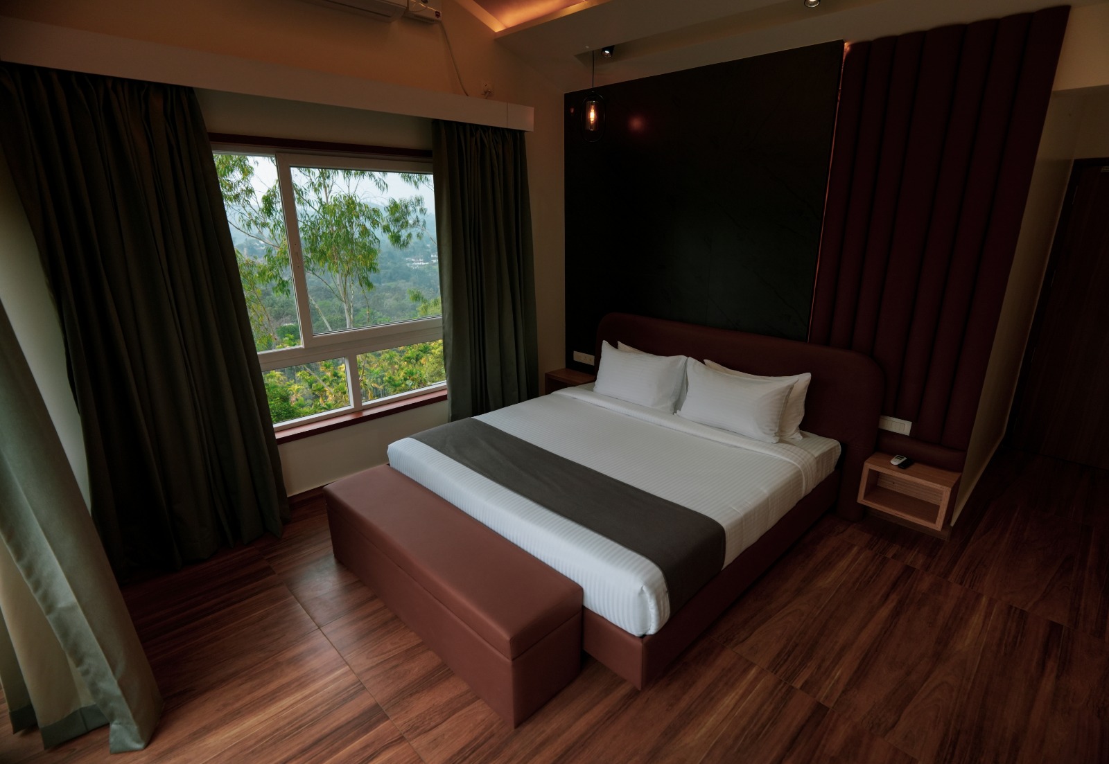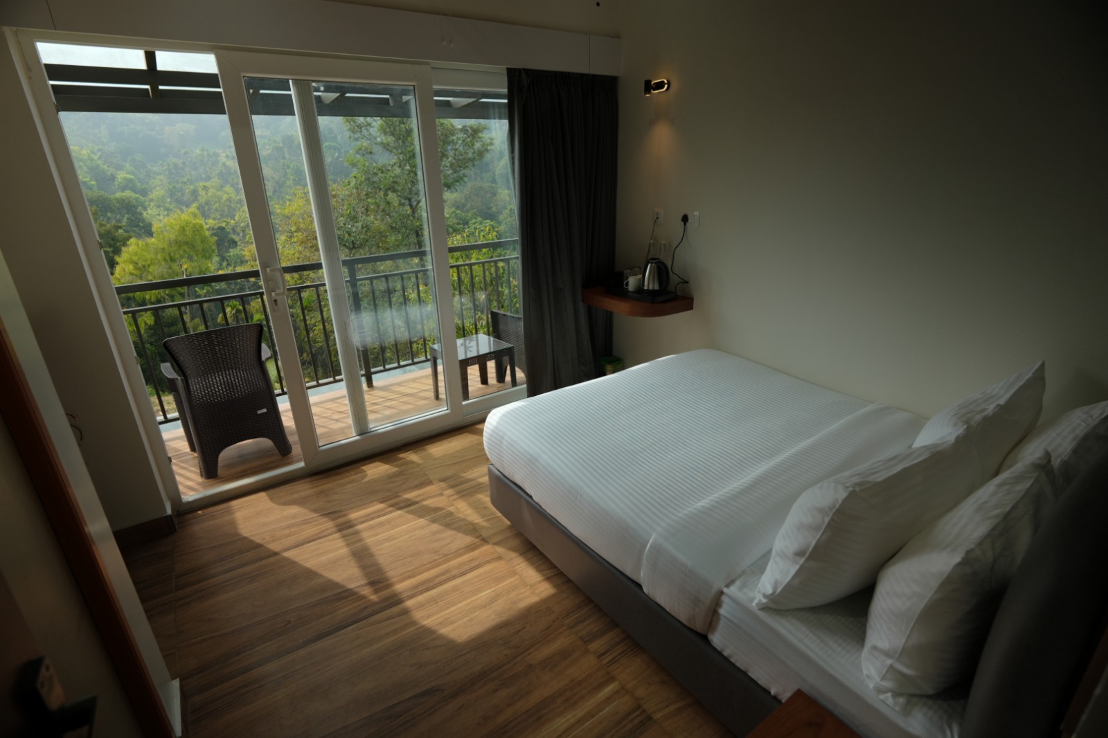 The room features elegant interiors, plush bedding, and a generous living space, complemented by large windows that frame panoramic valley views. Step onto the private balcony to enjoy cool breezes, quiet mornings, and calming sunsets that create a truly relaxing atmosphere.